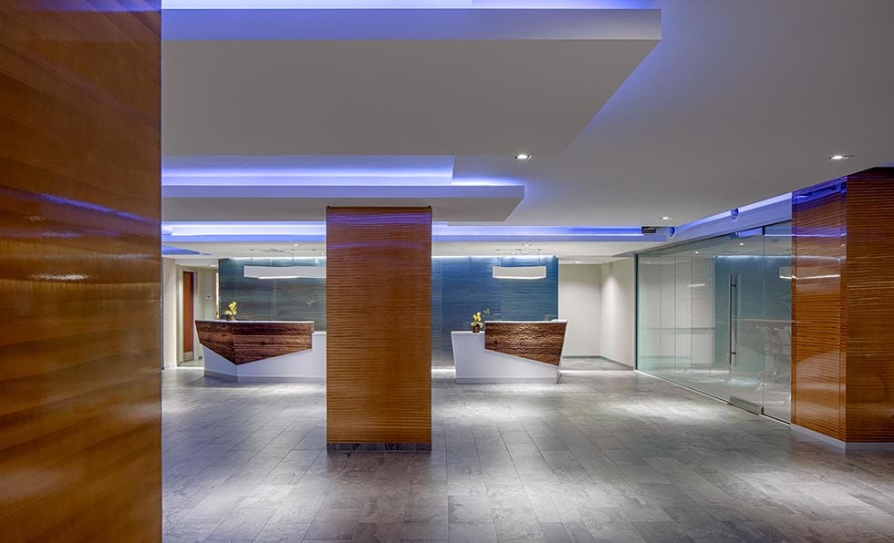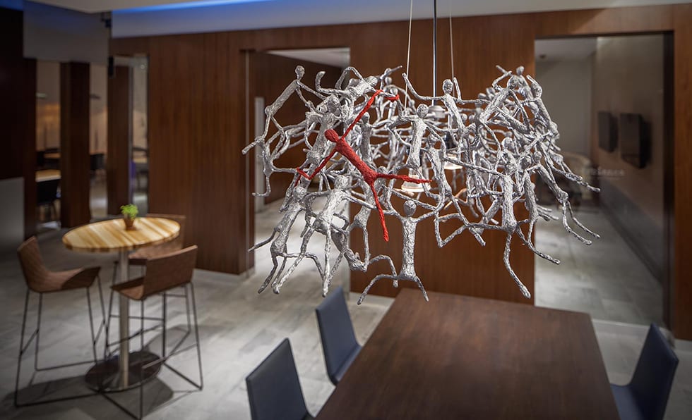 In the lobby, a blend of organic and high-tech materials connects to the idea of sailing, the beach, and sunrises.