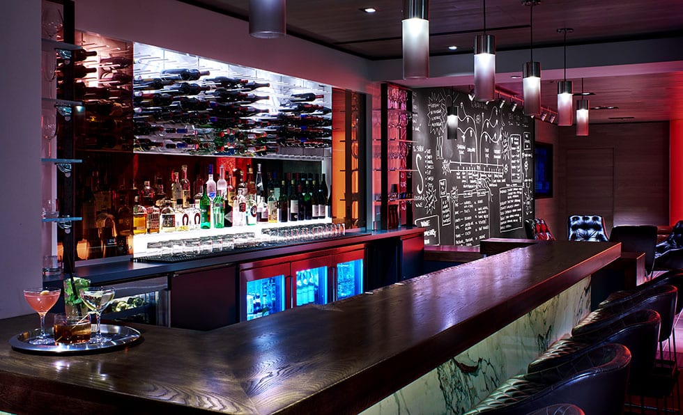 A Boston-based wine specialist was commissioned to decorate the lounge’s backdrop—a sealed blackboard wall—with notes from his lectures.