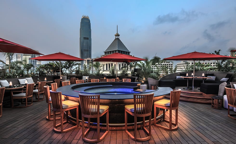 The rooftop Skybar, complete with lounge seating underneath red umbrellas, centers on a Jacuzzi.