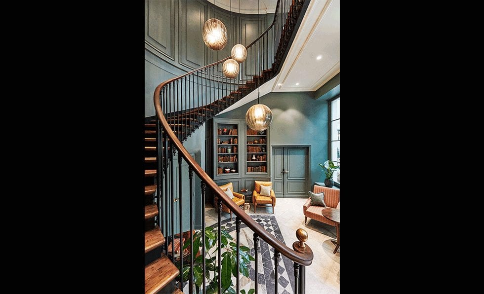 At 300 years old, the spiral staircase in the lobby was restored, relocated, and repurposed with iron columns.