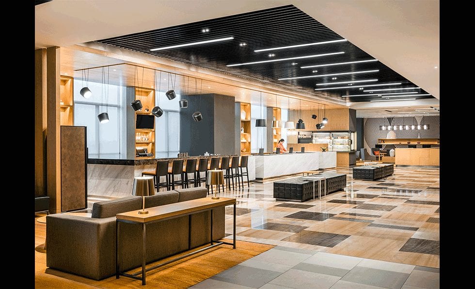 Ambient lighting concealed in the metal-louvered drop ceiling creates a feeling of warmth between the lobby’s wood-paneled walls and the striking checkerboard wood and stone floor.