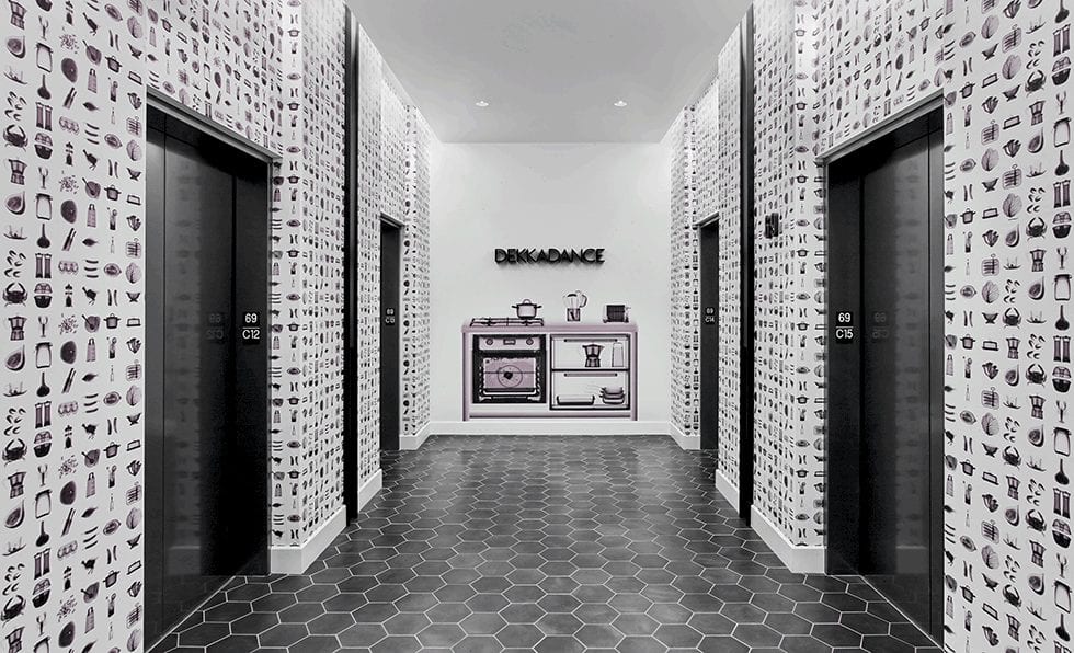 In the elevator lobby of Dekkadance, X-ray graphics of appliances and food add to its surreal ambiance.