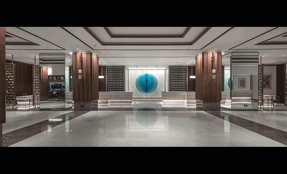 David Collins Studio references Korean culture in the lobby of the Le Méridien Seoul with a colorful, midcentury design and the artwork “Bloom” from Hee-Kyung Kim, which is crafted from traditional Korean paper behind the reception desk.