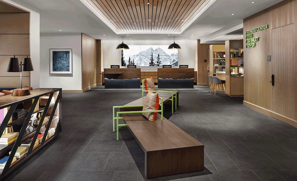 Nodding to its surroundings, lobby benches feature a playful green chair detail and reception desk silhouettes are informed by mountain ranges