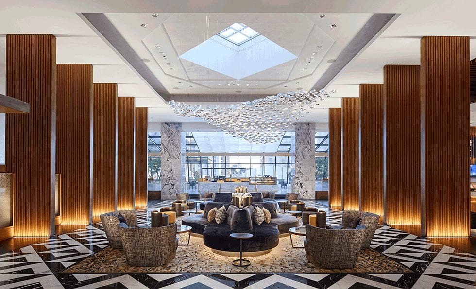 Metallic, Art Deco-style screens, a sculpture, and cool gray marble add dimension to an interior space off the lobby.