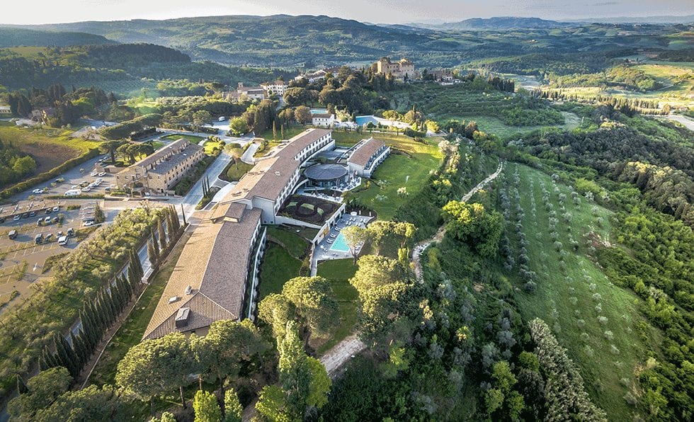 Architects Massimiliano Morlacci and Filippo Burresi looked to the colors and materials that shape the surrounding landscapes of Tuscany for the design of Hotel Il Castelfalfi.
