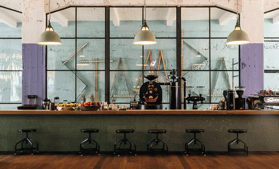 Pastel tones define the ground-floor Chocolaterie & Roastery
