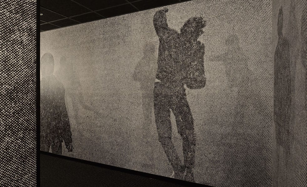 Old black and white newspaper photographs–many recalling the street protests of the 1960s through the 1980s–are silkscreened onto walls, as a reminder of the original occupants.