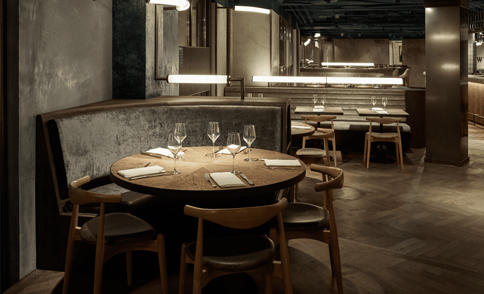 Housed within the light and airy Kimpton De Witt, Wyers Bar & Restaurant from local firm Studio Modijefsky serves as a darker contrast to the hotel with a weathered wall in clay-colored brown that welcomes guests into the moody space.