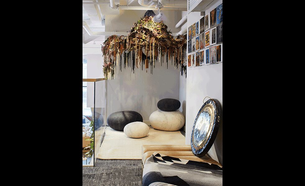 A breakout space in the Assemblage NoMad boasts a plant-covered canopy.