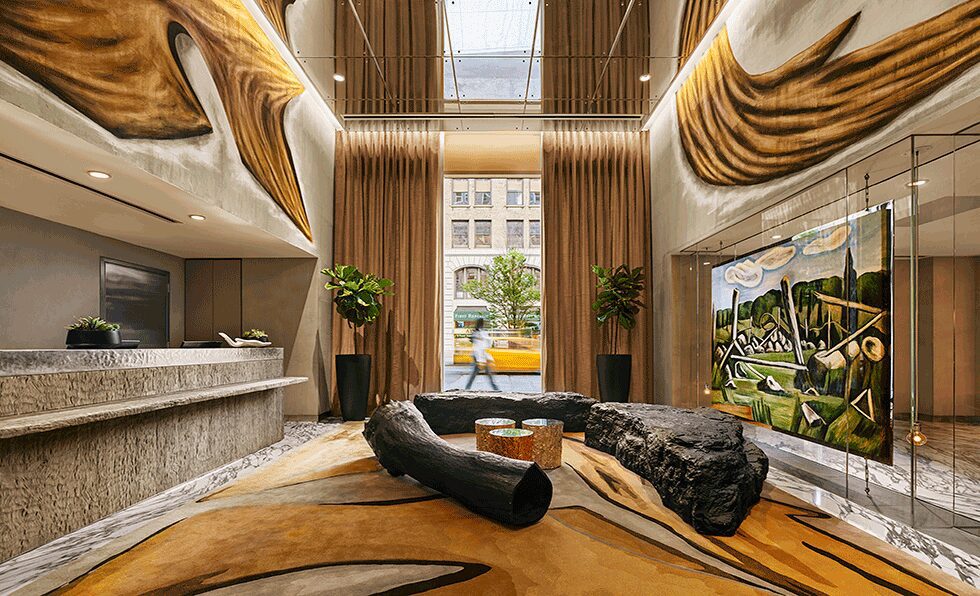The lobby in the Philippe Starck-designed Mondrian Park Avenue in New York features a tree trunk seating area