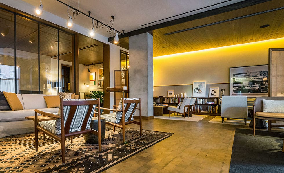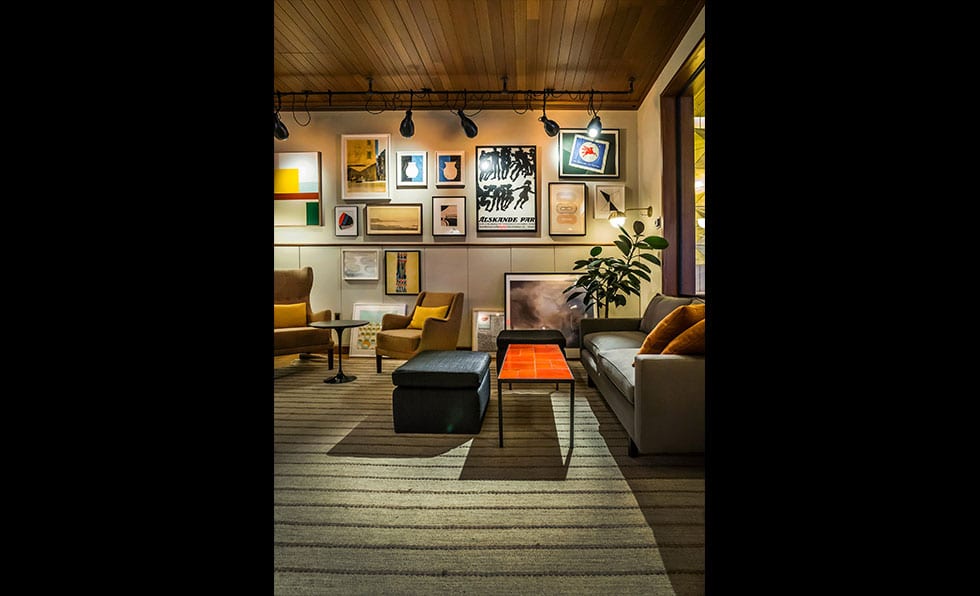 The lobby mixes Scandinavian and American mid-century furniture with a neutral color palette and local art, books, and photography.