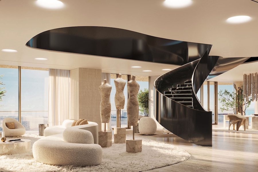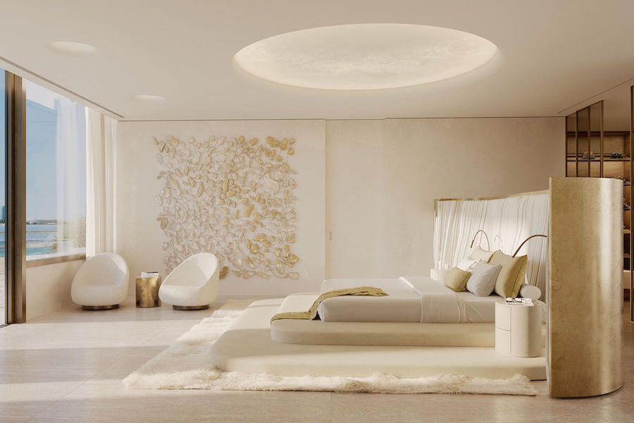 A custom furniture line—including sofas, armchairs, tables, chairs, beds, and lighting—has been created exclusively for the residences, forging a visual dialogue between the building’s sculptural form and its interiors.
