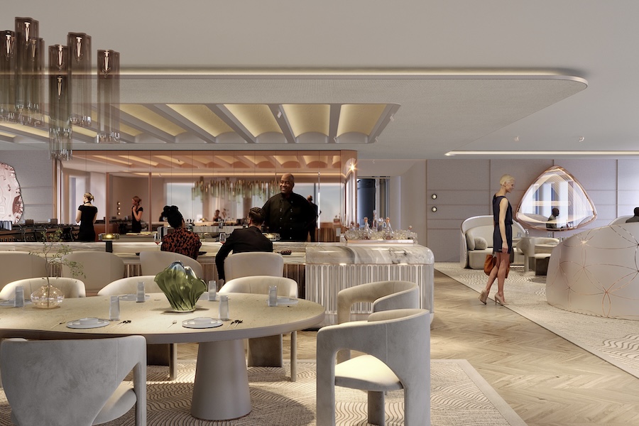 The vessel features a variety of amenities including a fine-dining restaurant and lounge with rotating culinary concepts, as well as a spa with treatment rooms, sauna, and wellness zones. There is also a fully equipped fitness center with yoga facilities and longevity-focused programming. An expansive beach club with direct sea access anchors life on deck.