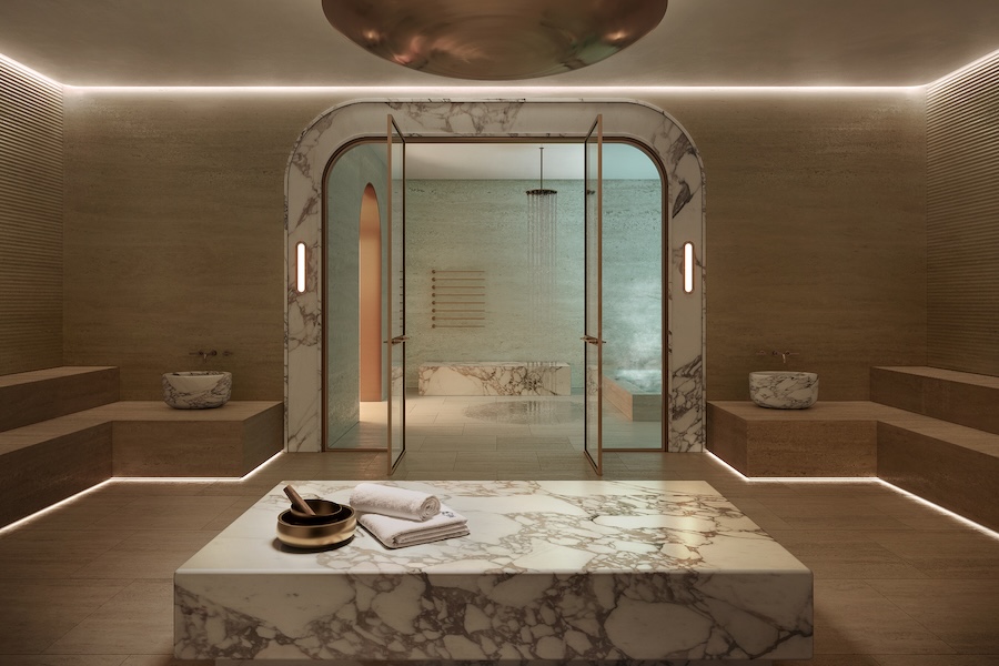 A dedicated floor houses a signature spa with hammam, infrared sauna, steam room, sound dome, Technogym‑equipped fitness center, yoga studio, meditation lawn, a lap pool, hot and cold plunge pools, and private padel and pickleball courts.