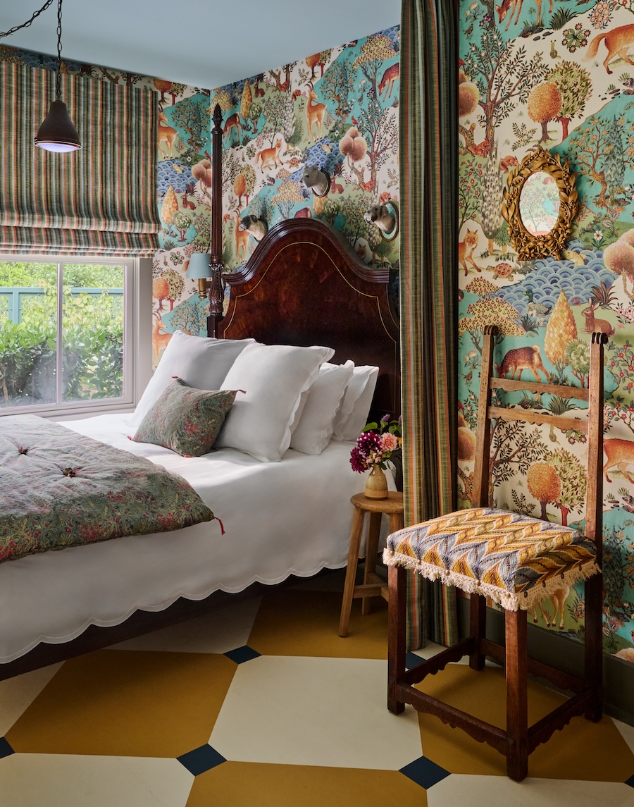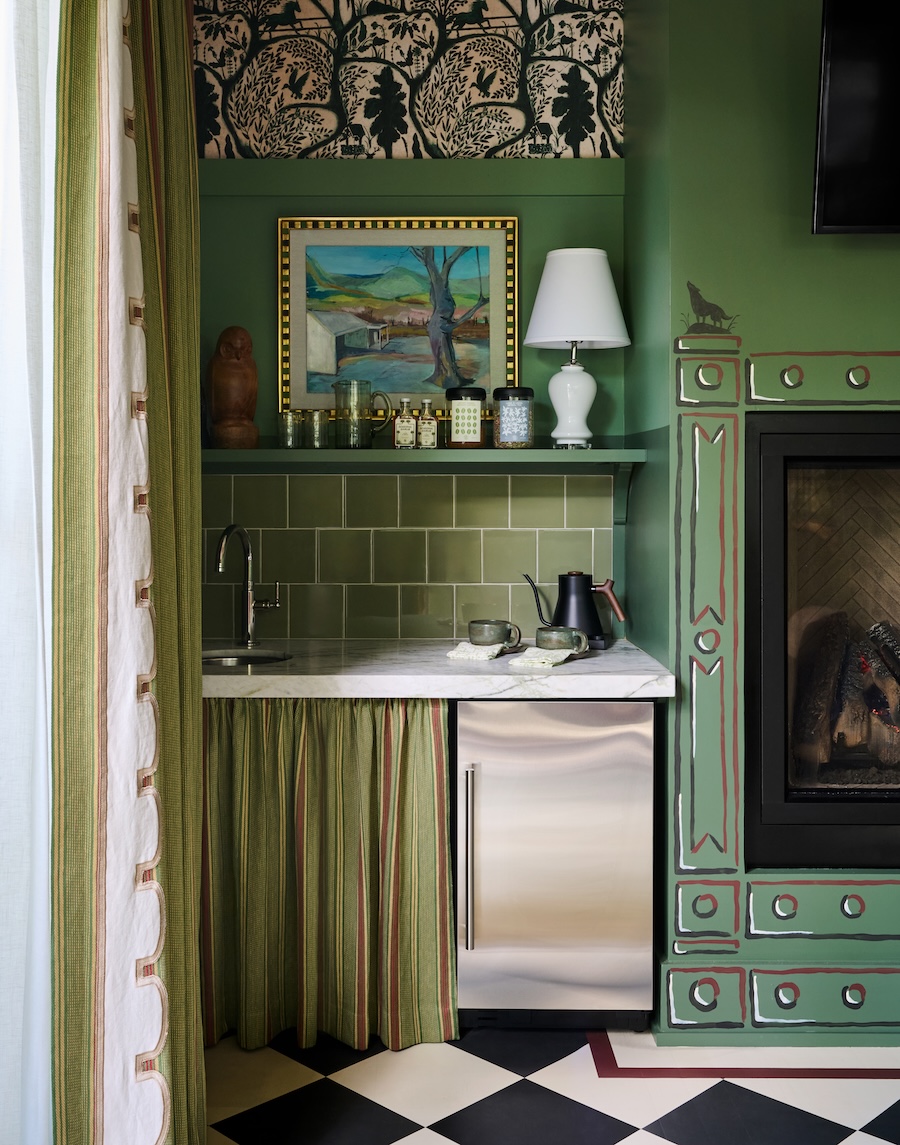 Fulk’s signature storytelling shows up throughout the project by way of custom patchwork furniture, aged brass fixtures, painted checkerboard wood floors, vibrant tilework, vintage‑inspired wallpaper, and handpainted armoires and trompe l’oeil details by painter Rafael Arana.