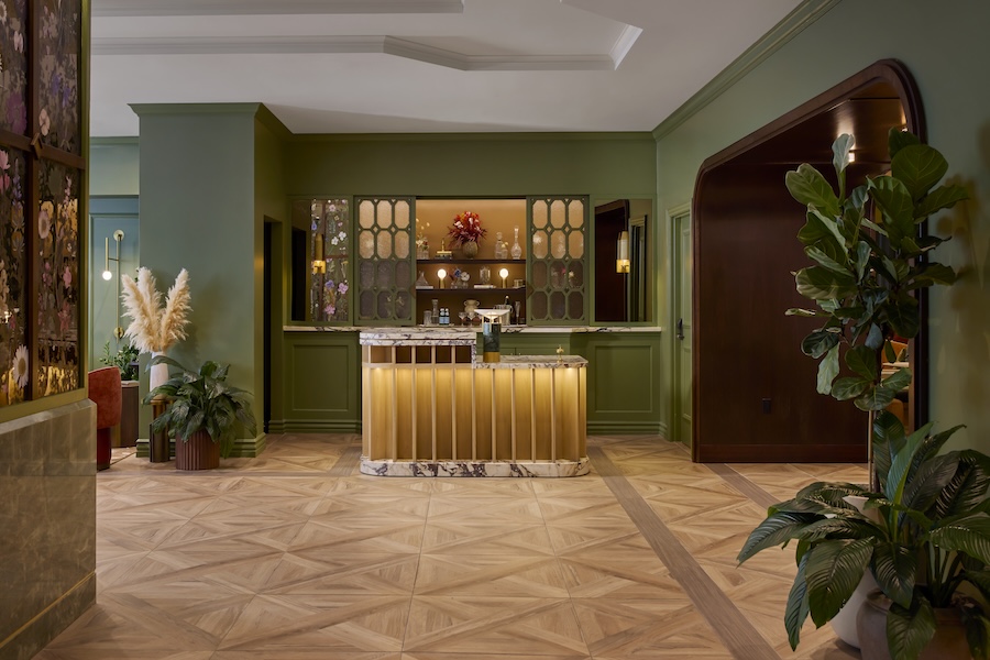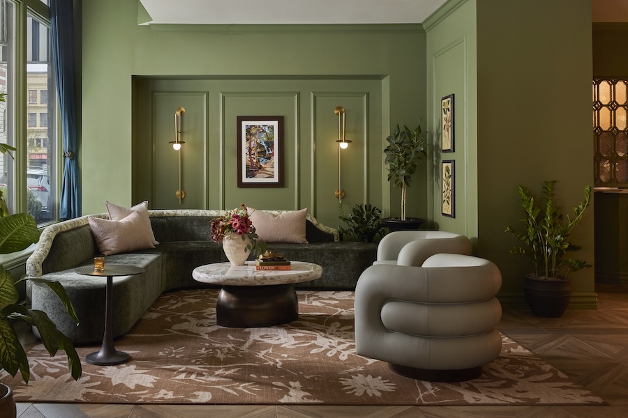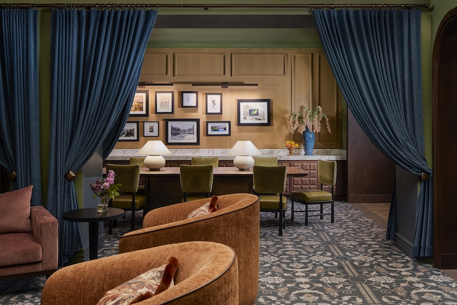 The 48 guestrooms and suites draw directly from the aesthetic of Davenport’s apartment via a warm palette of peach, burgundy, olive green, gold, and lavender.