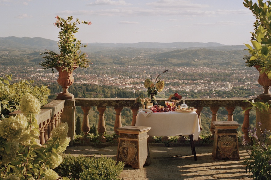 The hotel’s 2.4-acre terraced gardens, reimagined by Luca Ghezzi Garden Design, have been renewed with hidden nooks, fresh viewpoints, and Renaissance blooms such as roses, iris, and citrus trees, long favored by the Medici family.