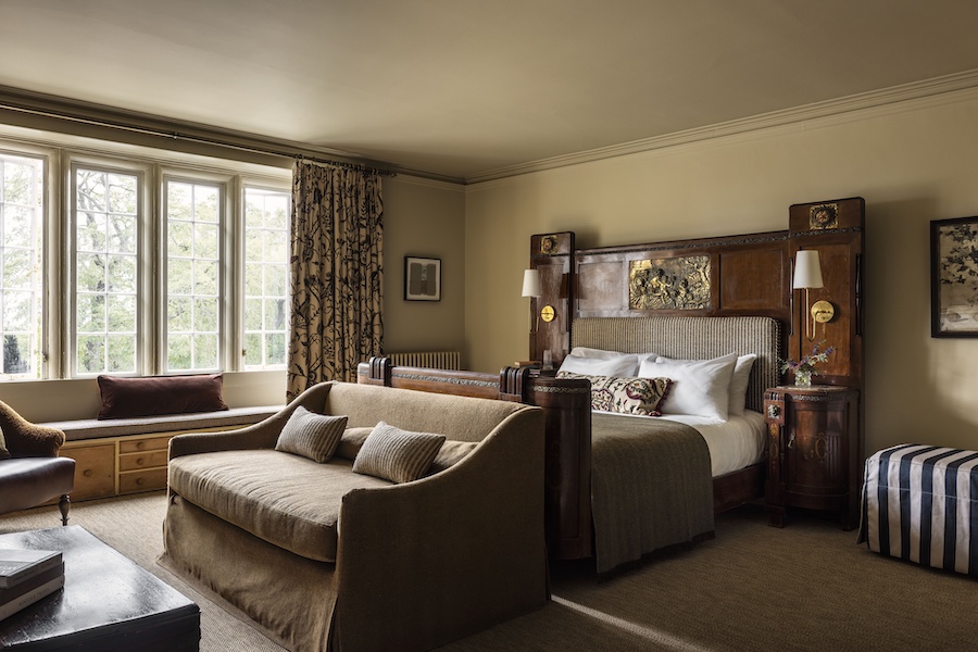 Led by London design studio StudioJill, the transformation embraces a new-yet-nostalgic approach that balances tradition with modern comfort. The design draws on the manor’s history through earthy tones, rich textures, crewelwork, aged oak, and rustic finishes, creating interiors that feel both timeworn and timeless.