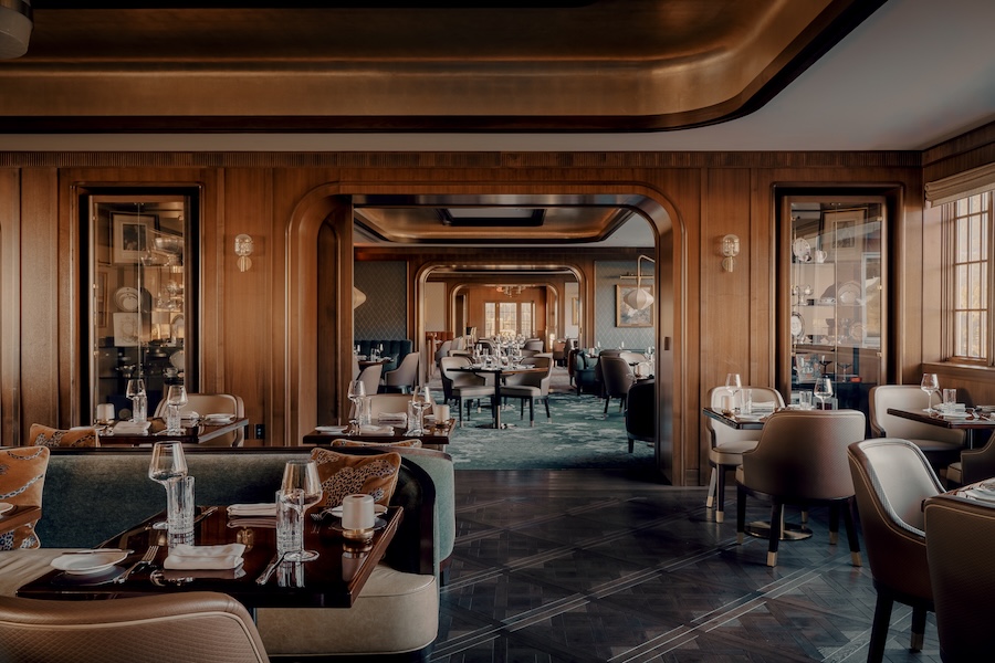 The arrival experience, dubbed the Courtyard Bar, is reminiscent of a grand secret garden with a double-height atrium featuring paned and vaulted glass windows and a retractable roof. Further into the restaurant, a number of distinctive spaces are unveiled: The Garden Dining Room feel like a classic, plaster-finished conservatory, while the Loggia Dining Room boasts parquet wood floors, a coffered ceiling, detailed millwork, and custom blown-glass chandeliers. The Ocean Bar comprises intimate lounge and al fresco dining areas across a terrace overlooking the bay.