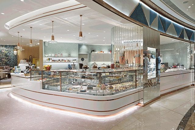 The concept exudes comfort with a color palette featuring pastel hues of peach, green, and blue. Large graphics animate the space, while custom banquettes and dining chairs deliver pops of color. Tulip chairs and blush-toned sofas add a dash of color alongside the contemporary and luxurious lighting scheme. Set against mint-colored walls, the café is also outfitted with an open kitchen designed to host cooking and baking classes.