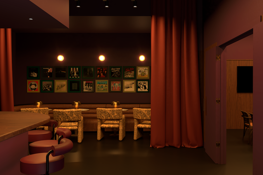 Eleven 11 follows the design scheme of vertical symmetry and achieves harmony by portraying dual possibilities of the same elements. The use of vibrant colors, including orange- and yellow-hued fabrics, is the common thread throughout the space. The flooring has been spruced up with tiny black geometric patterned white tiles, which continue onto the bar. In addition to a three-level amphitheater, seating configurations include ’90s diner-style arrangements to booth options.