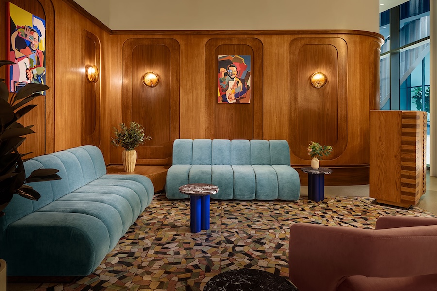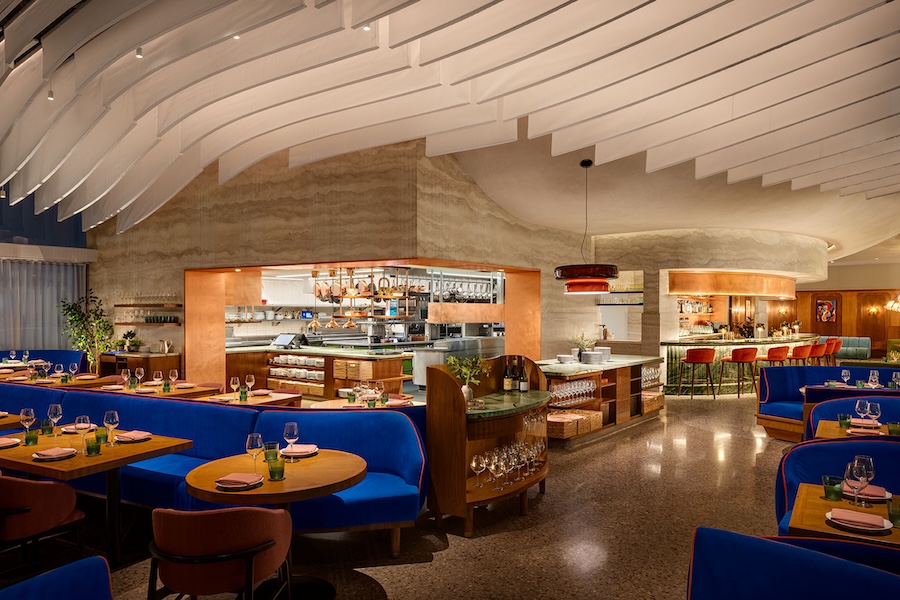 A freestanding modern structure clad in rust-colored steel sets a striking first impression, giving way to interiors that feel both sensual and welcoming. Vintage-inflected paneling inspired by antique yachts pairs with terrazzo floors in soft coastal hues and faded blue velvet seating. Portraits of the chef’s mentors add a personal layer of storytelling.