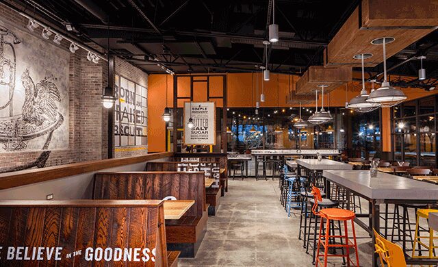 The new location is the sixth in the brand’s portfolio and welcomes diners with elements including repurposed railroad ties and exposed beams framing the entrance. Existing features such as exposed brick walls and concrete flooring serve as nod to the industrial roots of the setting. Custom-stained concrete communal tables accented with multicolored metal stools anchor the space, while a 25-seat outdoor patio offers alfresco dining.