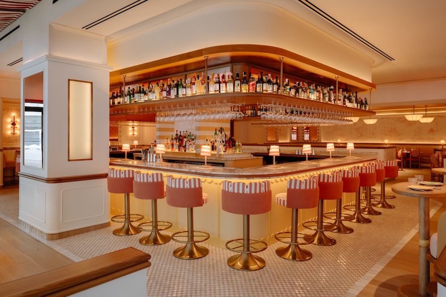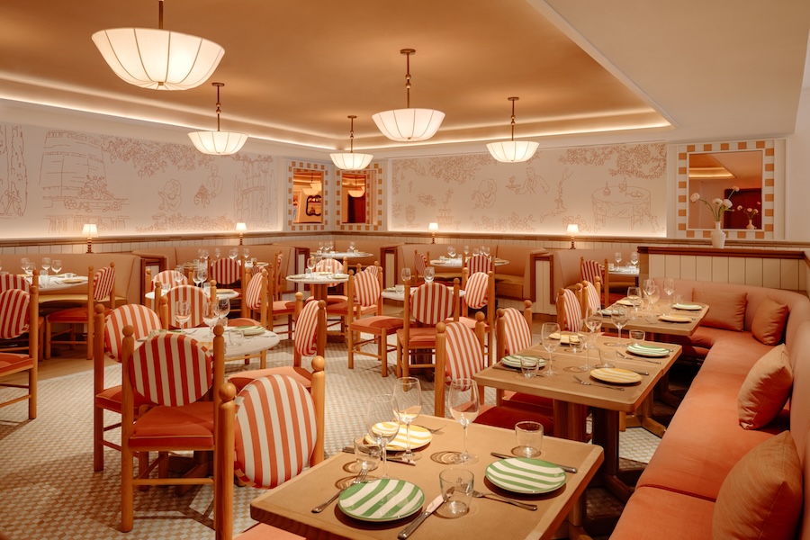 The dining room seats roughly 275 guests, while an expansive outdoor terrace can accommodate 100. Adapting to the seasons, the outdoor space will expand in the warmer months with a garden aperitivo area for an additional 150 guests. It will then transform into an intimate, chalet-like setting during the winter.