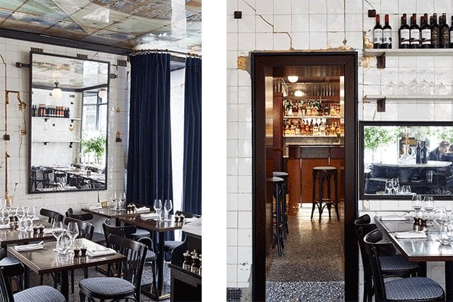 The eatery maintains its cracked porcelain—a testament to the venue’s longevity—along with the central counter, reverse painted glass ceiling, and globe lights. The revamp recalls the styles and luxury of 1940s steam trains, complete with mahogany wall panels covered in braided leather and custom opaline and polished brass wall lamps.
