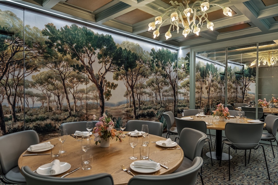 Guests enter through a serene bar and lounge area that serves as a transitional threshold from Midtown’s energy, leading into a warm, enveloping main dining room. A flexible private dining room functions as both an intimate gathering space and a full event venue.