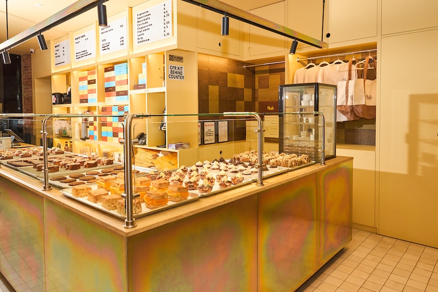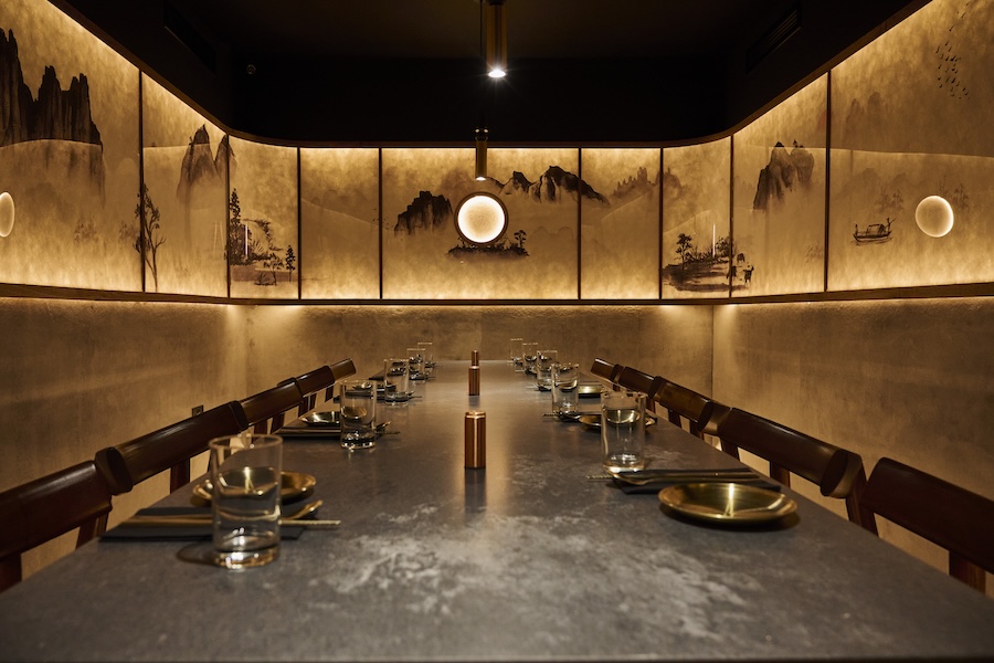 The main room was designed to evoke the feel of a study in a world traveler’s home, with built-in bookcases that showcase a curated selection of books and treasures collected from the owners’ trips around the world.