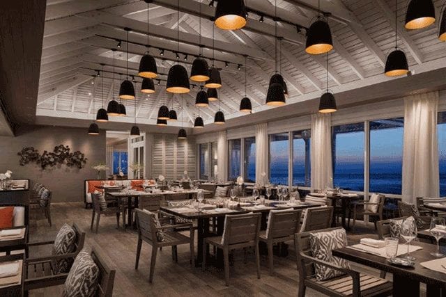 Spanning 226 seats across its dining and lounge areas, the interior has maintained its resort-style ambiance but has been brightened with a new material palette that includes dove gray Anigre wood millwork, warm gray upholstery accented in coral fabrics and abstract, geometric patterns, and porcelain floor tiles finished in cerused wood.