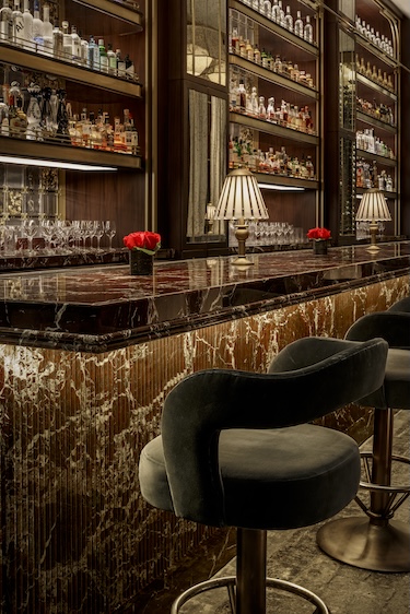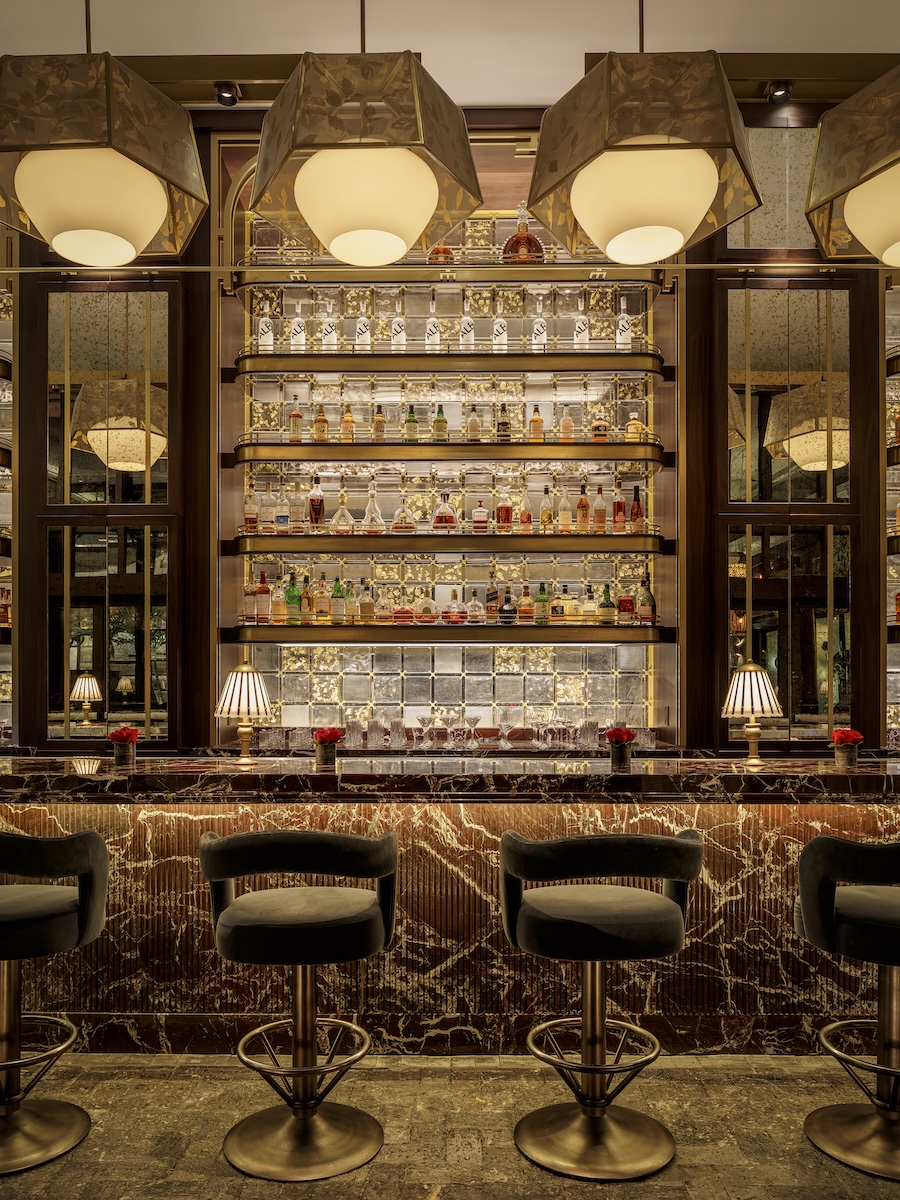 “Designing the lobby bar meant creating a space that feels both rooted in the Setai’s Art Deco legacy and alive with modern, intimate energy,” says Sean Saladino, chief designer at Saladino Design Studios. “Each material was chosen to evoke warmth and quiet drama, from the sculptural resin forms of the back bar to the carved stone and brass details. The result is a bar that doesn’t simply sit within the lobby—it becomes a glowing centerpiece that celebrates the hotel’s timeless elegance.”