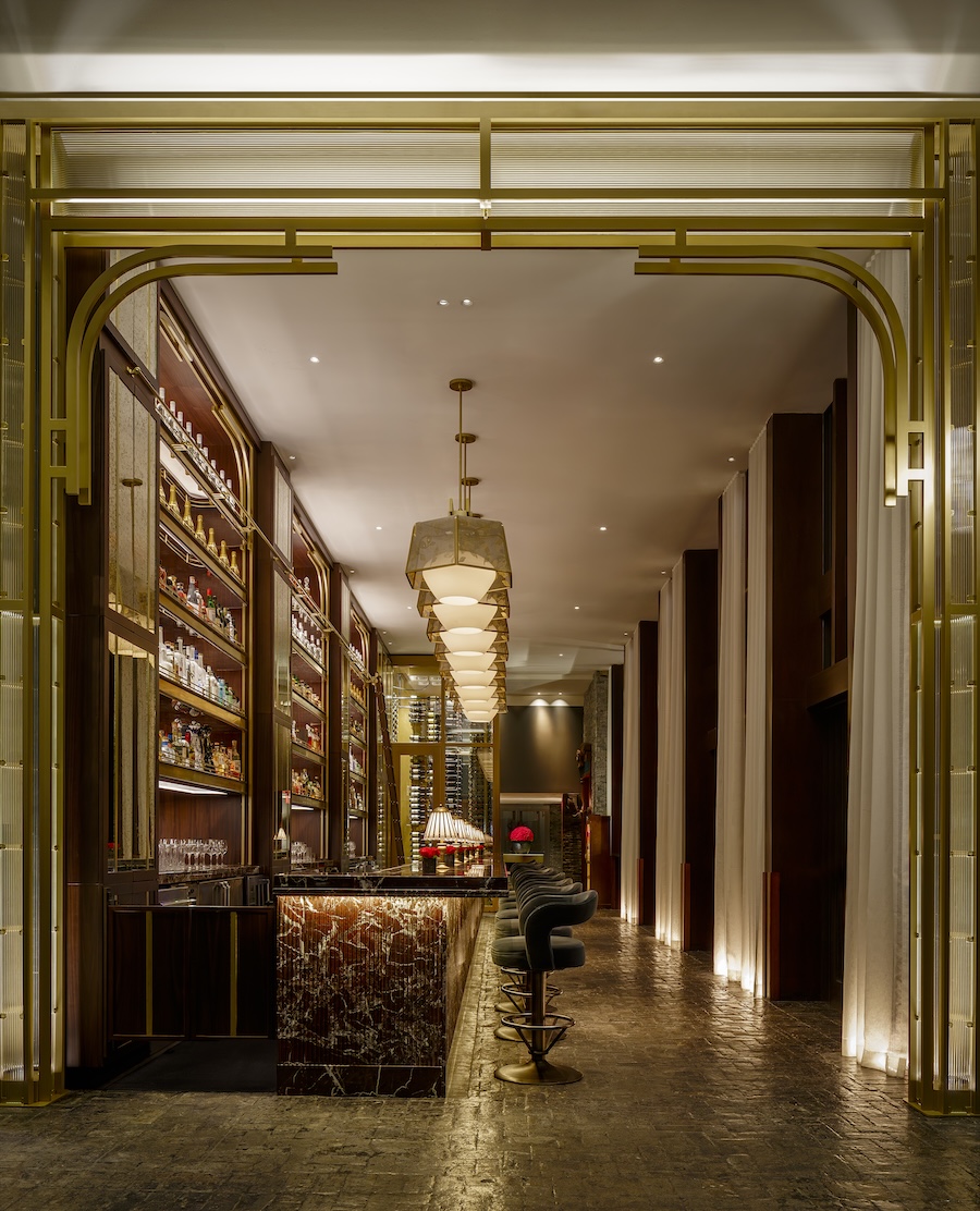 The bar counter is anchored in Rosso Levanto stone, its deep burgundy tones and white veining softened by a bamboo-inspired relief and rounded edges designed to encourage lingering. A custom wine tower and bespoke lighting fixtures wrapped in handpainted gold mesh complete the composition, lending the space a quiet intimacy.