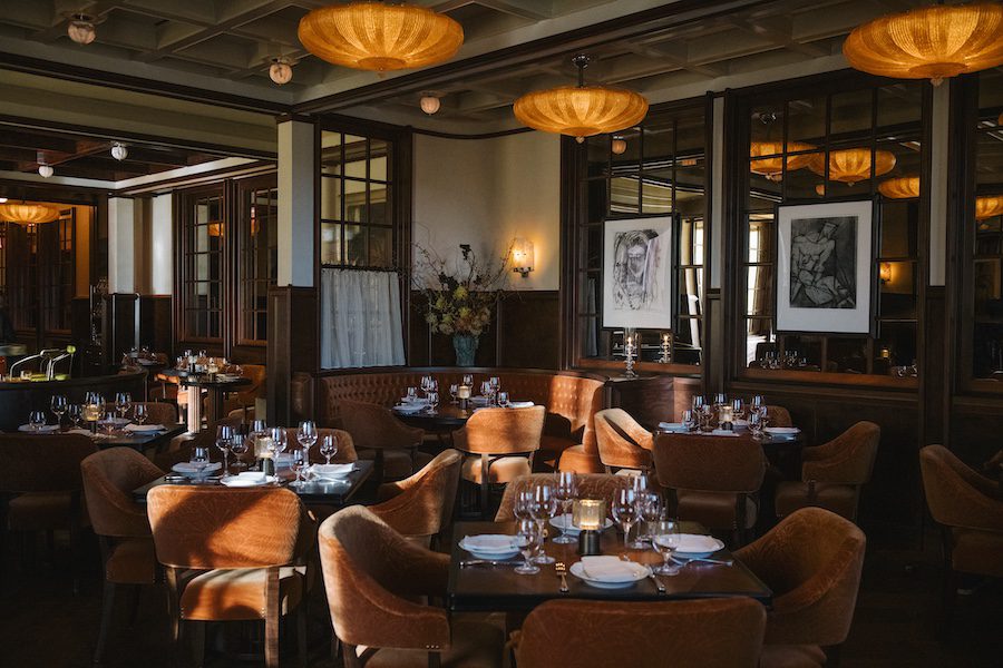 In the café, a midcentury carpet featuring a Pablo Picasso motif contrasts against chestnut-hued wall paneling, while polished café tables infuse the space with saffron and bronze tones.