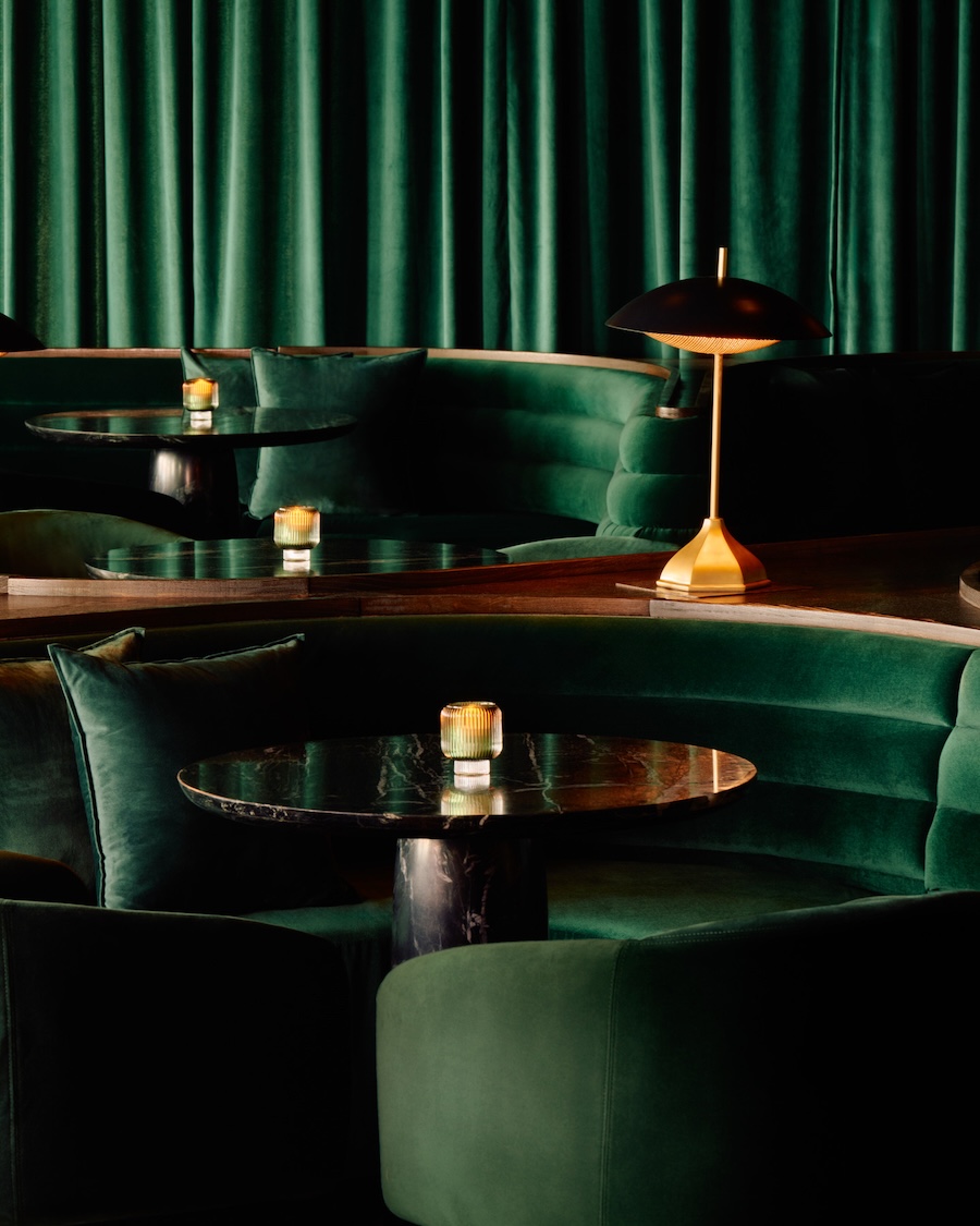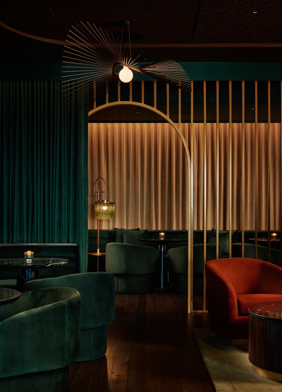 A private dining room, meanwhile, extends from the main lounge and is screened by brass detailing and velvet drapery, providing a secluded setting for gatherings.