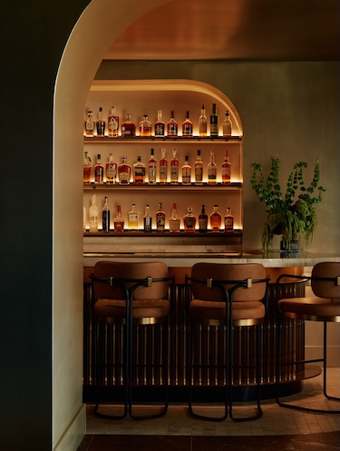 A private dining room, meanwhile, extends from the main lounge and is screened by brass detailing and velvet drapery, providing a secluded setting for gatherings.