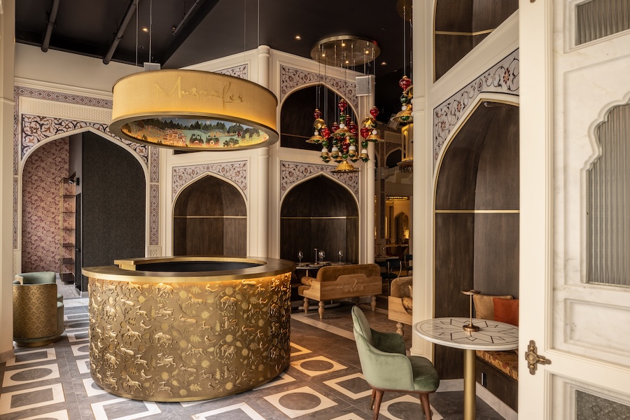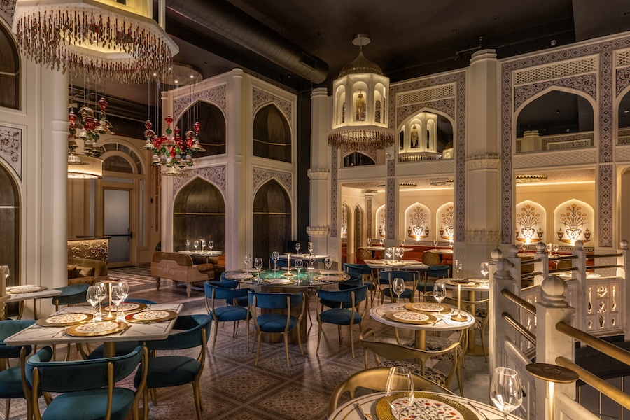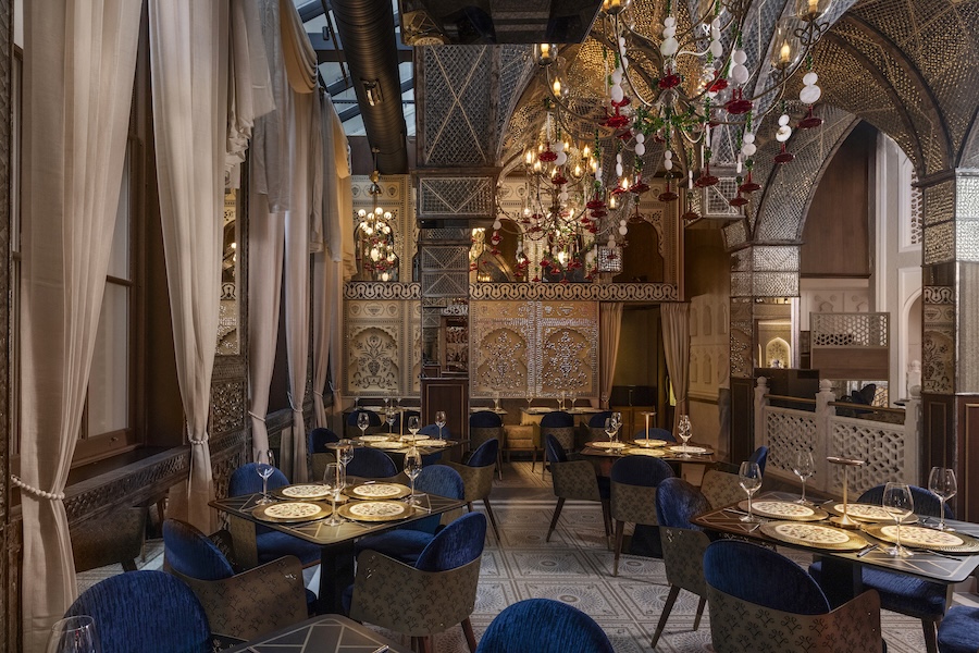 The design echoes this narrative, channeling the spirit of discovery through interiors that reinterpret vintage Indian architecture and reference landmarks like the Taj Mahal. The space unfolds through ntricate patterns, sculptural period furnishings, and curated antiques.