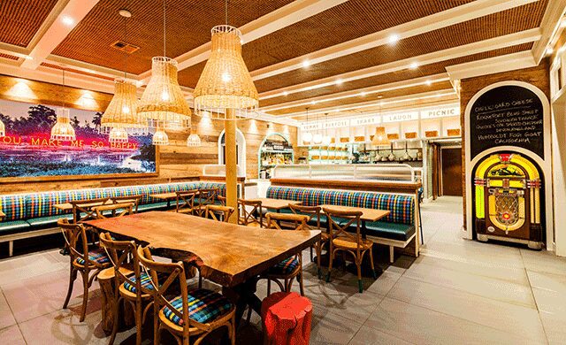 Like an indoor picnic space, the interior is populated with edge-wood slab tables accented with plaid cushioned seats which are illuminated beneath the suspended wicker pendants. A bayou-inspired mural adorns the rear wall, while traditional picnic blanket motifs further infuse a sense of the outdoors. An open kitchen anchors the dining room along with a bar detailed with a steel counter accompanied with woven blue barstools and cubbies that showcase cozy picnic baskets.