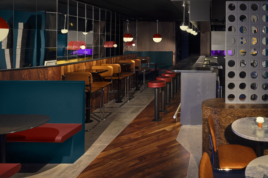 The arrival experience is punctuated by towering columns featuring undulating half-moon motifs above two-story patinated copper bases reminiscent of samurai swords. A natural stone host stand is positioned before a full-height wooden slat backdrop, while a sand-hued color base is complemented by rich notes of green, copper, and black. End-grain flooring spans the interior along with black wood tile and walls coated in sandy plaster. Studio K’s Karen Herold also hand-fabricated an installation of a sculpture composed of resin leaves, which establishes an autumnal forest canopy in the dining room—a natural contrast to ultra-modern furniture throughout.