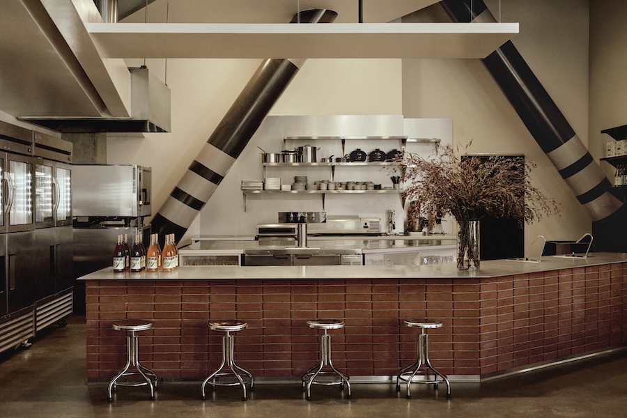 Wood totems used for retail display nod to designers like Ettore Sottsass, while architectural finishes introduce an industrial edge. The café bar is clad in standard builder’s brick paired with heavy-gauge stainless steel, and the shared bathroom vanity features painted stripes inspired by Mario Botta, along with a stainless steel portal accented by custom linear lighting.
