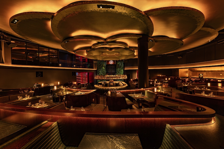 At the heart of the main dining room, a dramatic chandelier comprising 78,000 mother-of-pearl shells cascades from above, illuminating walls clad in reflective hexagonal mirrors.