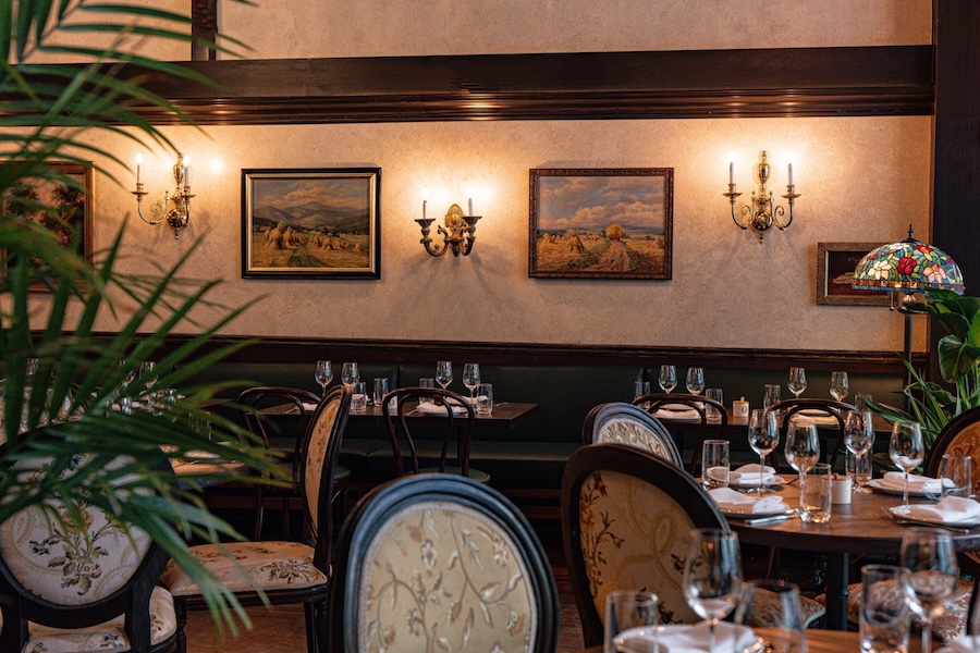 The interior design draws heavily on rustic Italian warmth, incorporating dark wood trim and molding, extensive indoor greenery, and antique chandeliers that soften the scale of the soaring space. Floral-patterned dining chairs and hand-picked art pieces further root the trattoria in a residential sensibility.