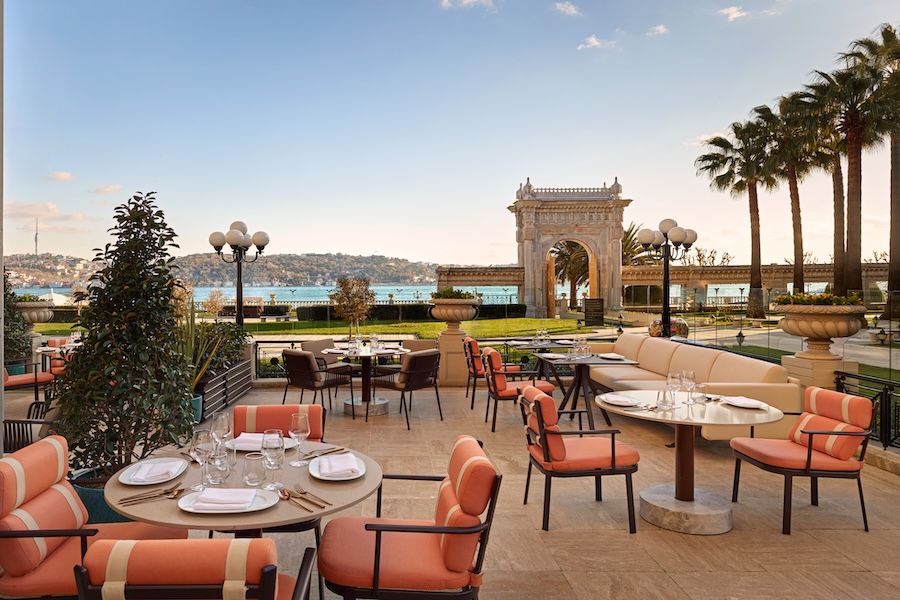 The design finds its ultimate breath on the restaurant’s terrace, which functions as a lush sanctuary that opens directly onto the manicured gardens of Çırağan Palace.