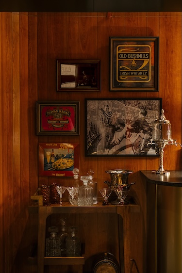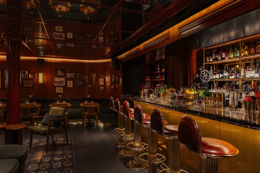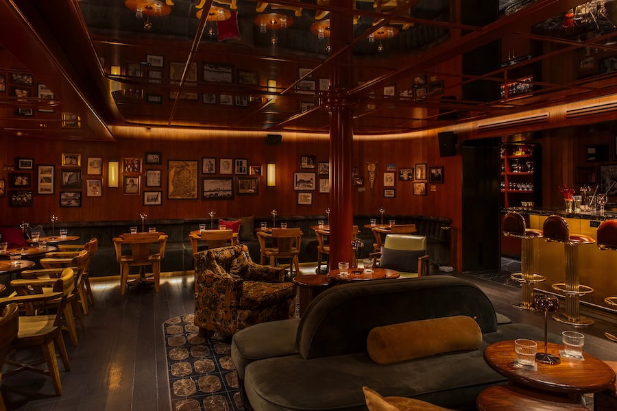 The room is enveloped in dark cherry wood paneling, which pairs with the subtle glow of lacquered finishes. Seating arrangements feature deep green velvet banquettes and custom mahogany tables, offset by vintage lounge pieces from the 1960s and ’70s. Dark green and brown velvet curtains add an additional layer of warmth and midcentury texture, making the space feel both lived-in and polished.