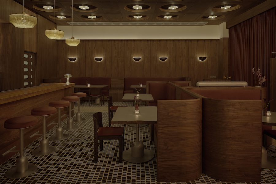 Spread across 6,000 square feet, the revamped eatery has been opened to the sidewalk to promote the activity within. The lounge and bar area have been moved closer to the front of the house, which welcomes guests via a teak-shuttered vestibule. The luminescent bar and lounge is appointed with comfortable seating configurations including leather benches and rattan easy chairs. The curved bar appears as if it were carved from a large block of natural plaster. The interior is finished in silver leaf squares, while the bar is topped with polished teak and clad with a geometrically inspired tile motif on its face. Custom light fixtures overhead recall traditional woven fishing baskets.