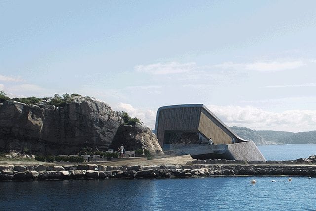 Snøhetta has debuted renderings for what is proposed to become Europe’s first underwater restaurant. Plotted for development in the coastal city of Båly, Norway, the eatery’s design comprises a concrete monolith half-emerged from the sea, which extends roughly 16 feet below the surface.