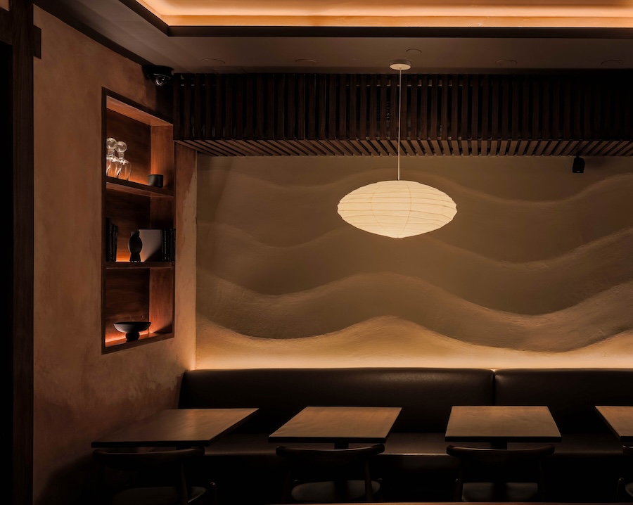 Handcrafted details drive the design narrative. Paint behind the bar was applied entirely by hand without brushes, lending subtle texture, while a sculptural clay wave installation introduces movement within the seating area. Seaweed curtains sourced from Japan create a soft partition between the bar and kitchen, and custom bar stools are precisely arched for ergonomic comfort.