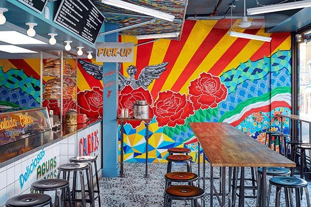 Handpainted, vintage-style signage from artists BrushBoys and patterned blue and white floor tiles radiate with color, contrasting a large, vivid mural. A multicolored webbed awning cantilevers the takeout counter, mimicking the designs of traditional puestos, or street food stands. The awning is crafted from industrial nylon strips woven by hand through chainlink fencing. Fluorescent tubing dangles diagonally above counter-height tables, a touch also inspired by the food markets of Mexico.